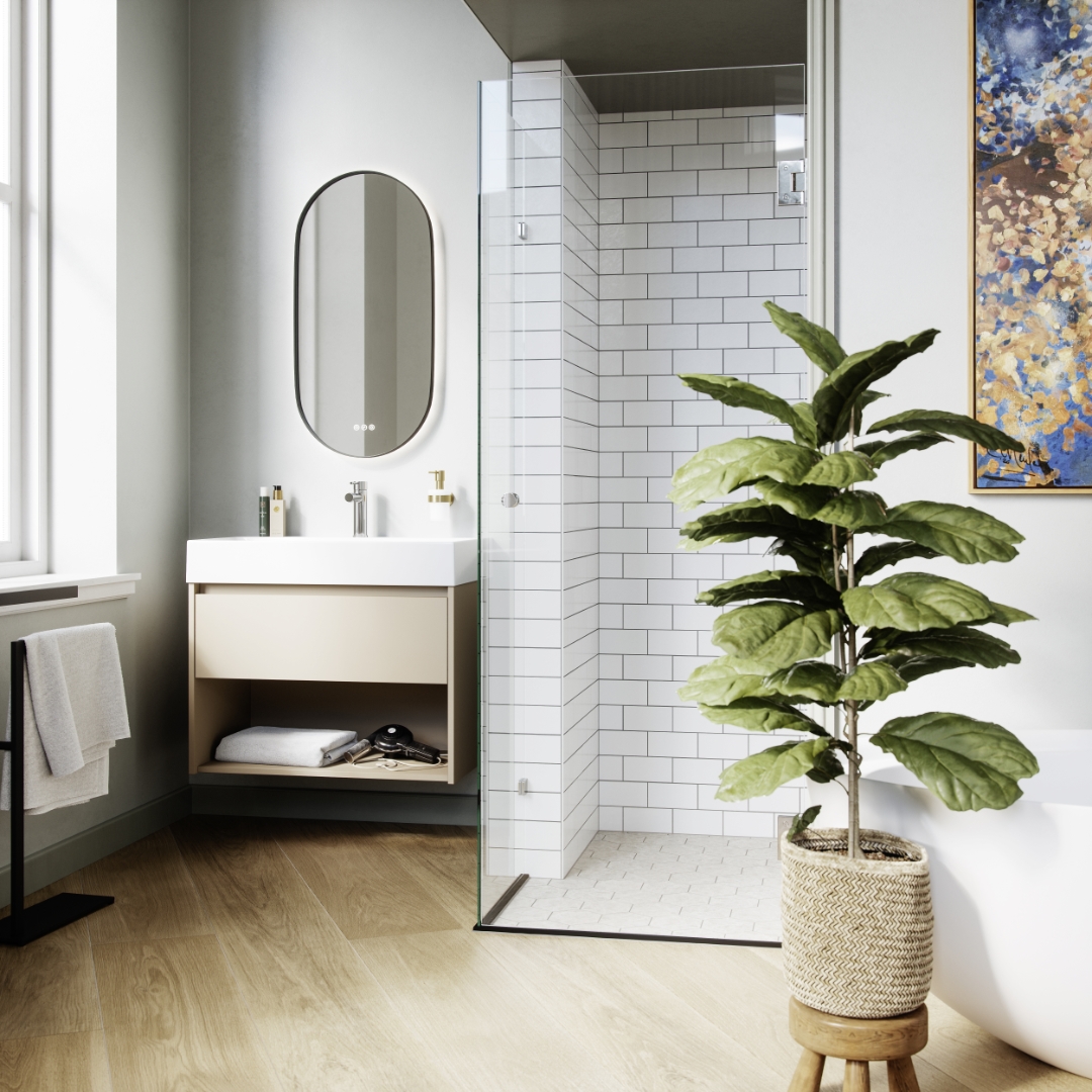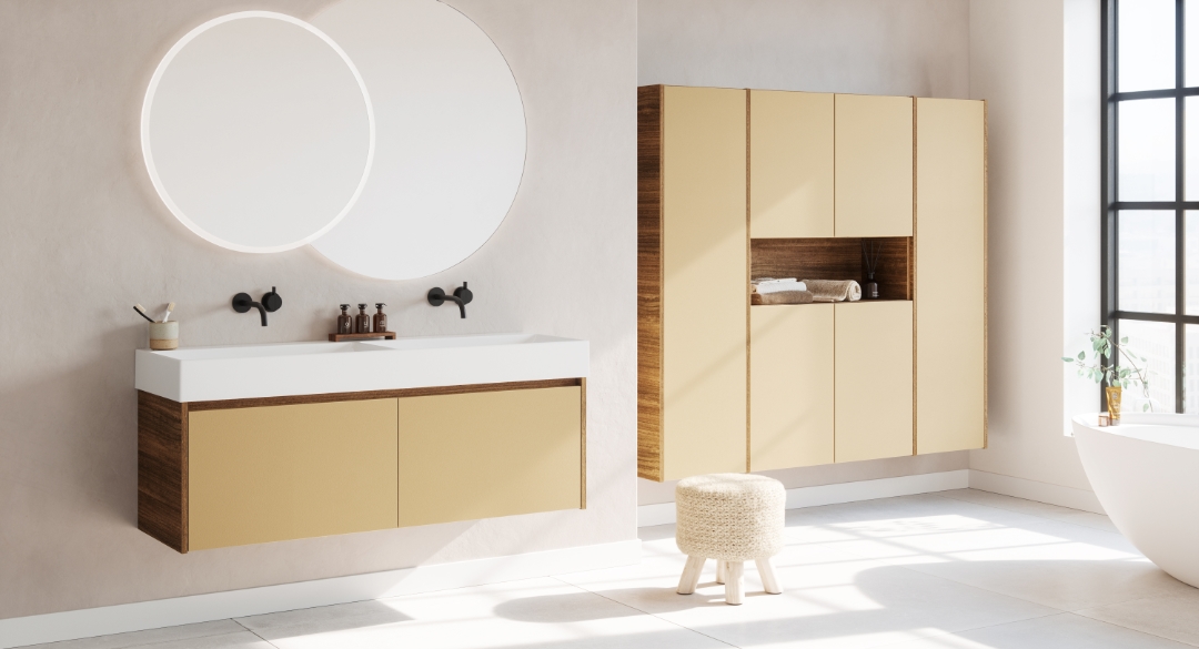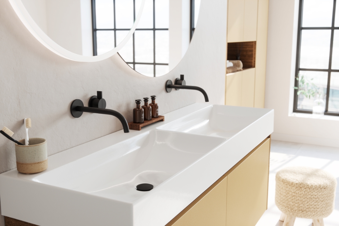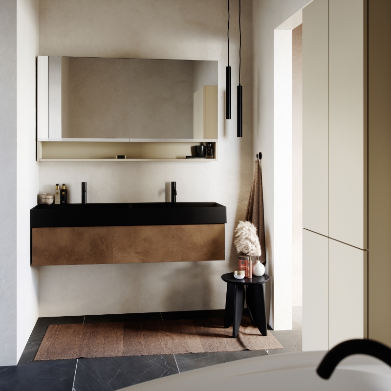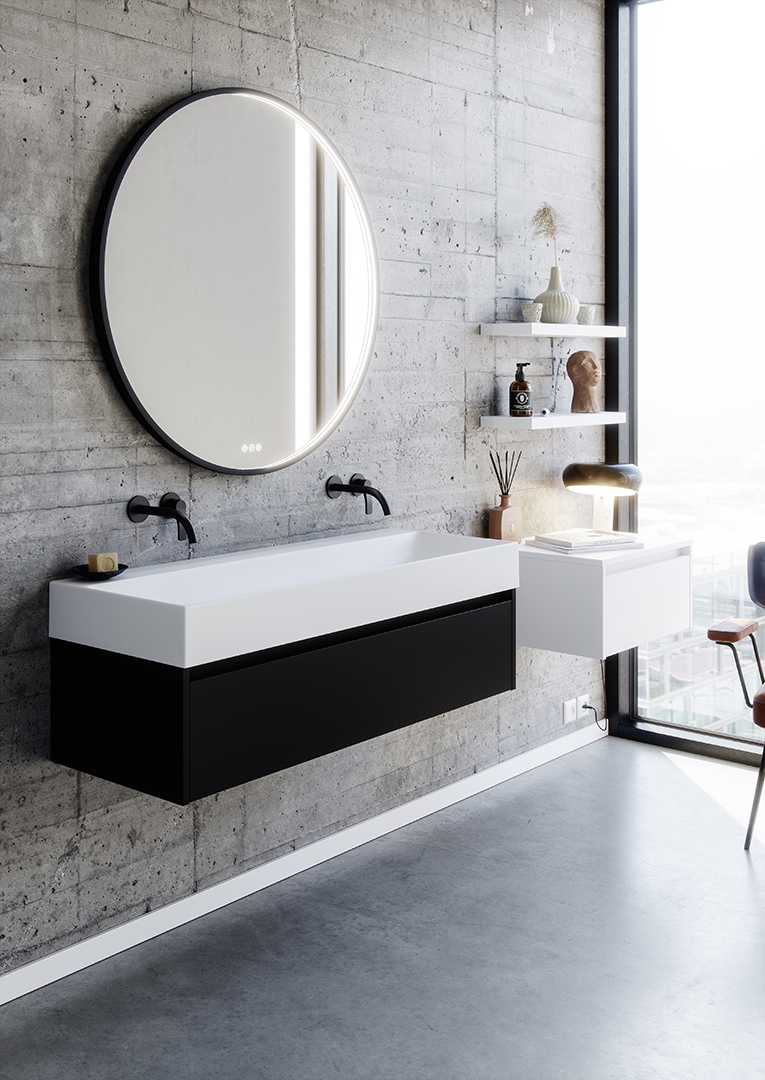 Robust and sturdy yet stylish. The ceramic washbasin top is characterized by its imposing height, right angles and stylishly rounded wash basin.
