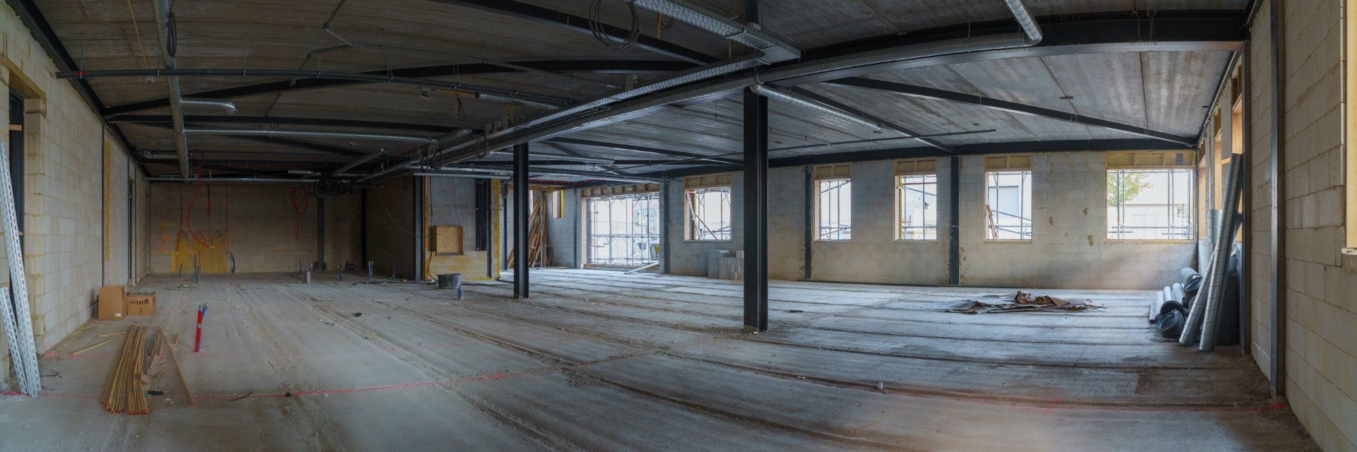 The brick exterior wall is almost complete and hard work is being done inside on the pipework, electricity and underfloor heating. In the meantime, the floors on the 1st and 2nd floor have already been poured.